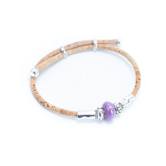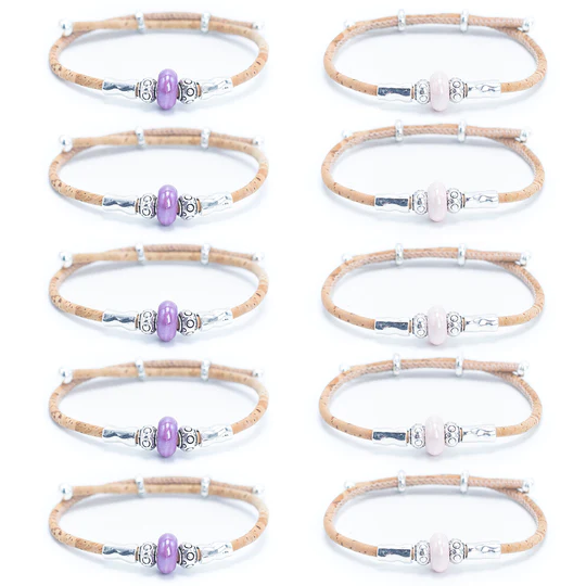Bracelet en liège ajustable, avec une perle de couleur Mauve ou Rose