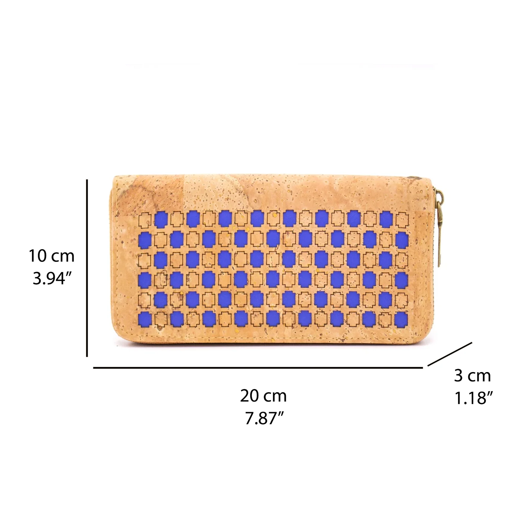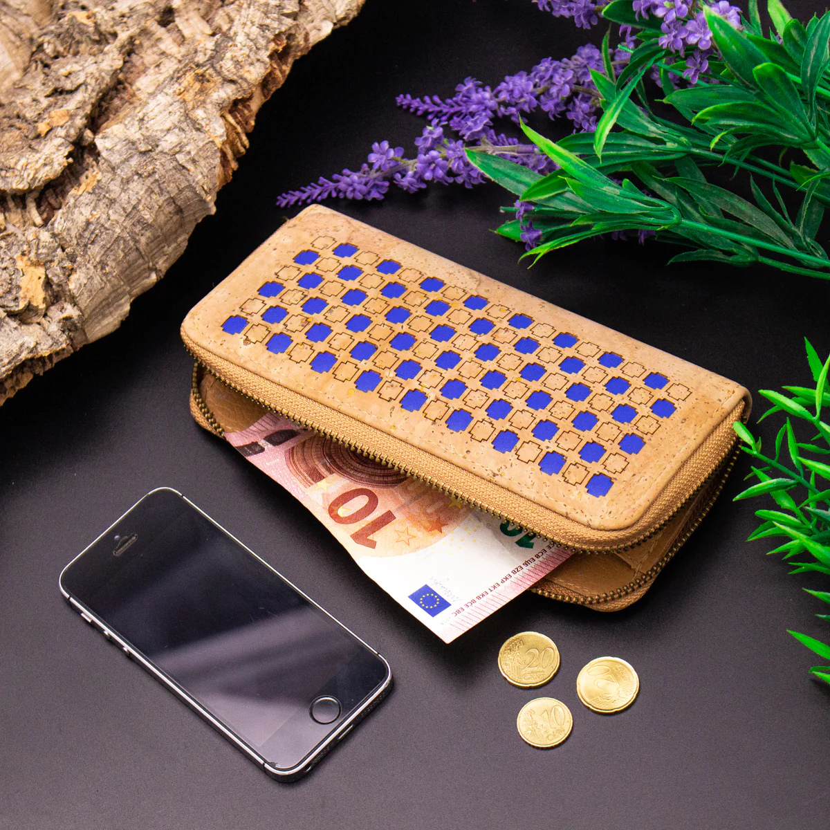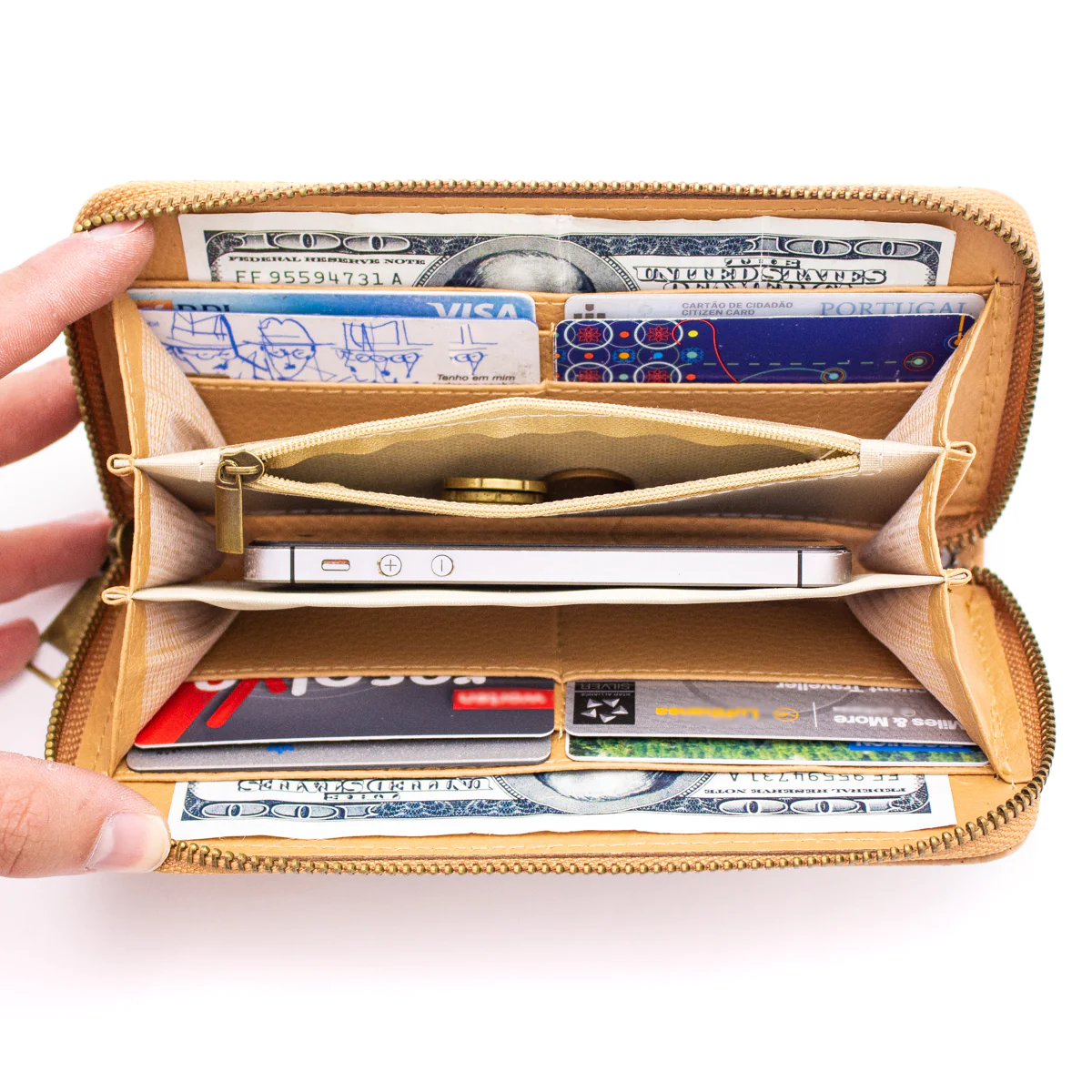 Portefeuille en liège avec 8 emplacements pour cartes, 2 poches pour billets, une poche zippée pour vos pièces de monnaie et un espace pour ranger vos papiers ou billets.